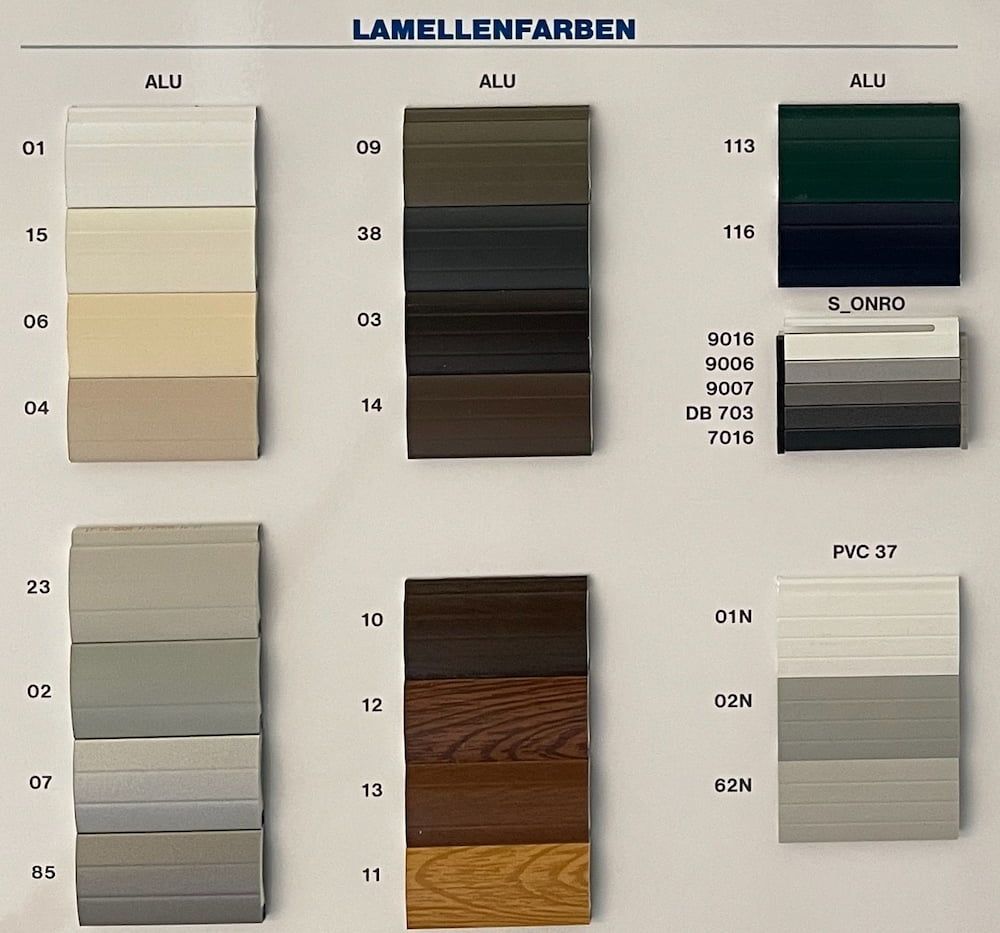 Der Rollladenpanzer ist in 18 Farben, der Kasten, die Führungsschienen und die Unterleiste in 6 Standardfarben sowie in RAL-Beschichtung erhältlich.